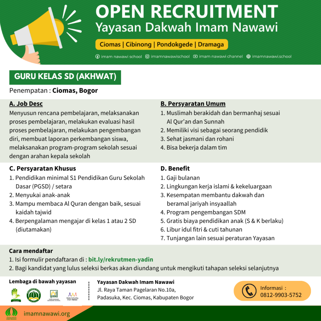 Yayasan Dakwah Imam Nawawi (YADIN), sebuah lembaga nonprofit yang bergerak dalam dunia Pendidikan. Dibangun dengan tujuan dakwah, dengan sistem manajemen yg Islami, profesional dan terbuka. Kami mengajak kaum muslimin yang memiliki kemampuan serta memiliki ghirah keislaman dan dakwah tinggi untuk bergabung bersama kami membangun pendidikan Islam yang berkualitas dan terjangkau bagi masyarakat, melalui lembaga-lembaga pendidikan di bawah naungan YADIN.